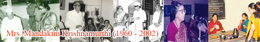 Mrs. Mandakini Krishnamurthi assisted Dr. Muthulakshmi Reddy in her work till 1960, when she finally took over as the Honorary Secretary and Correspondent, which position she held till a debilitating illness disabled her in 2002